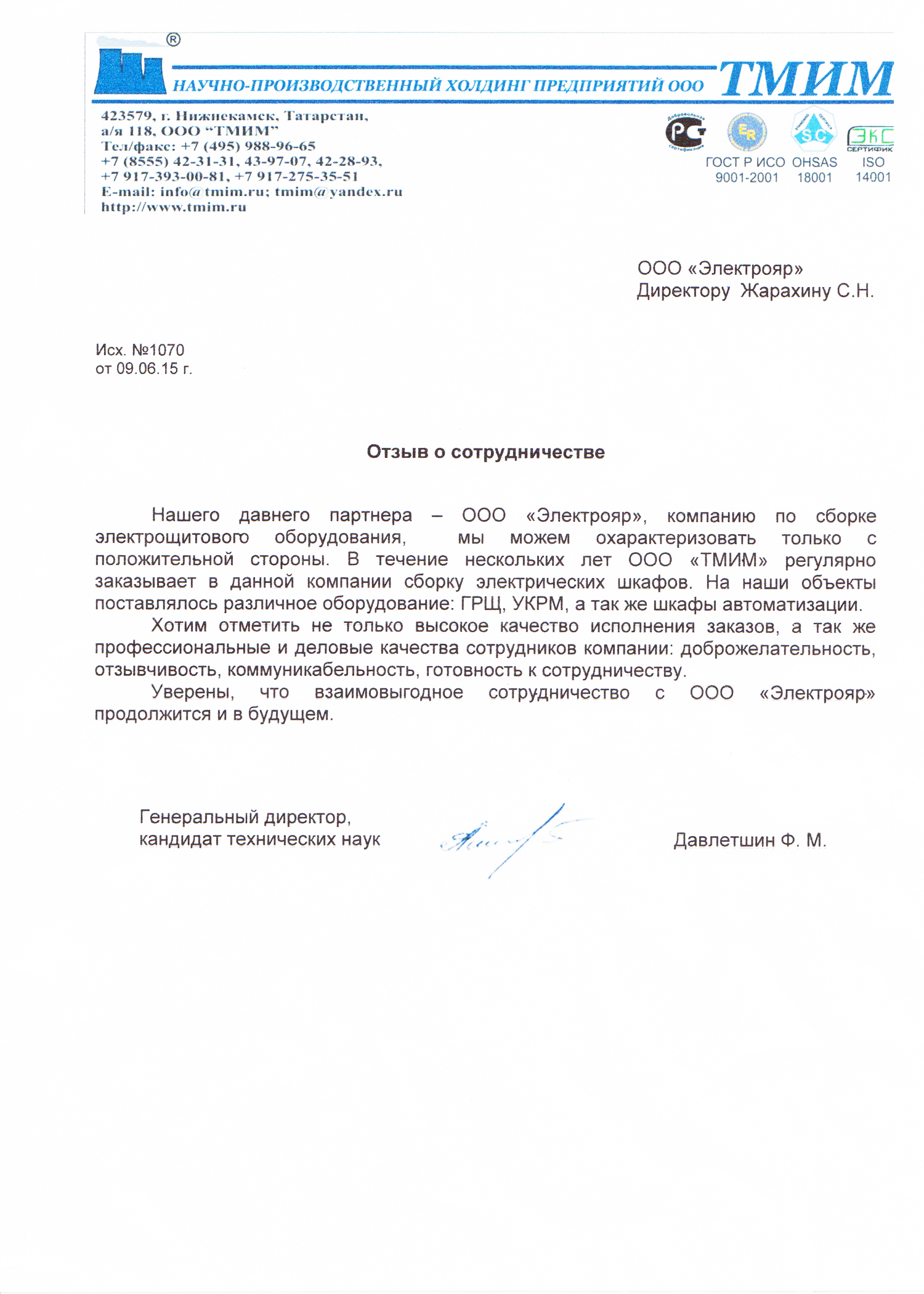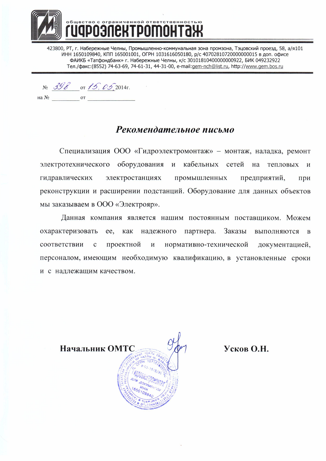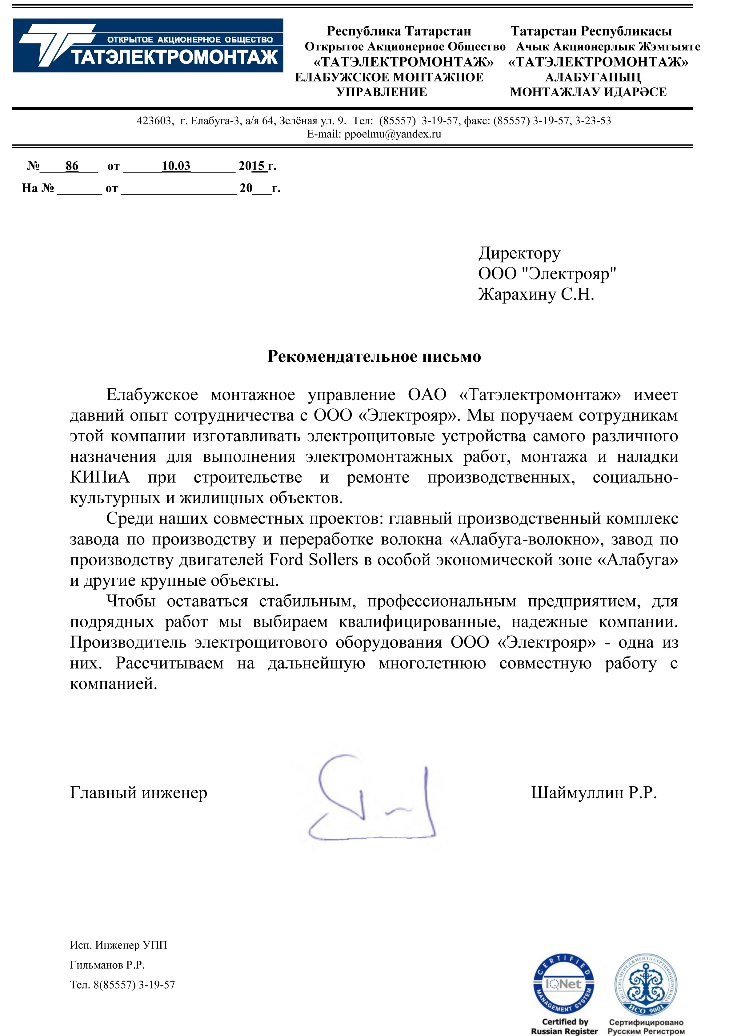 ОАО «Татэлектромонтаж», рекомендательное письмо