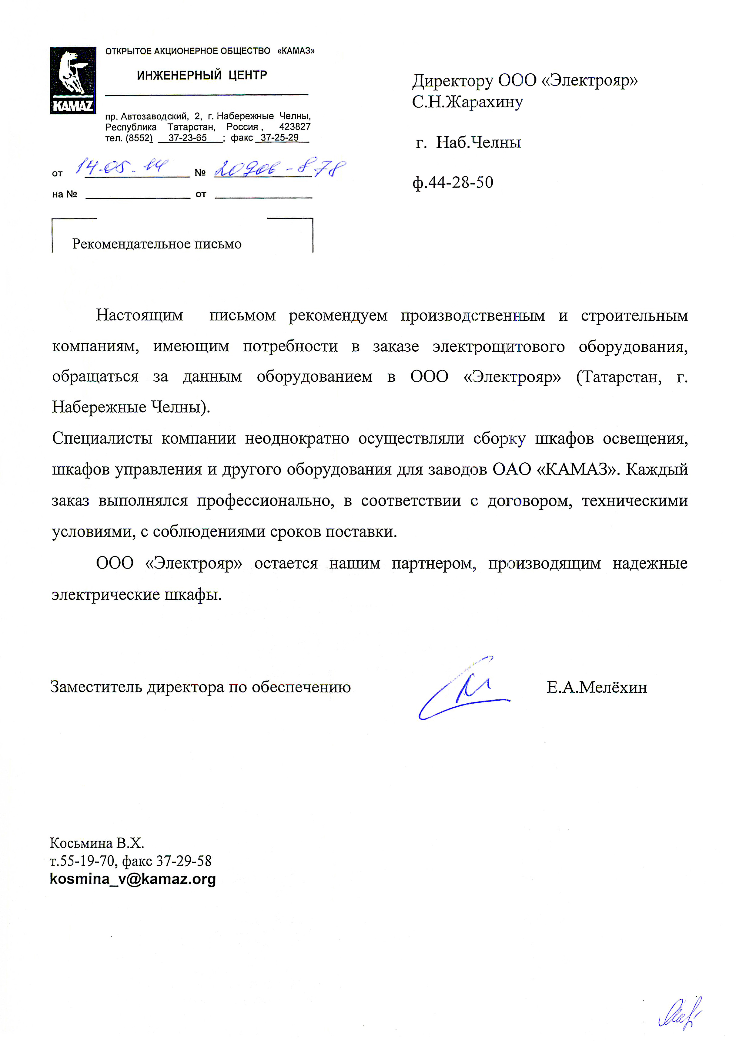 Инженерный центр «ОАО КАМАЗ», рекомендательное письмо