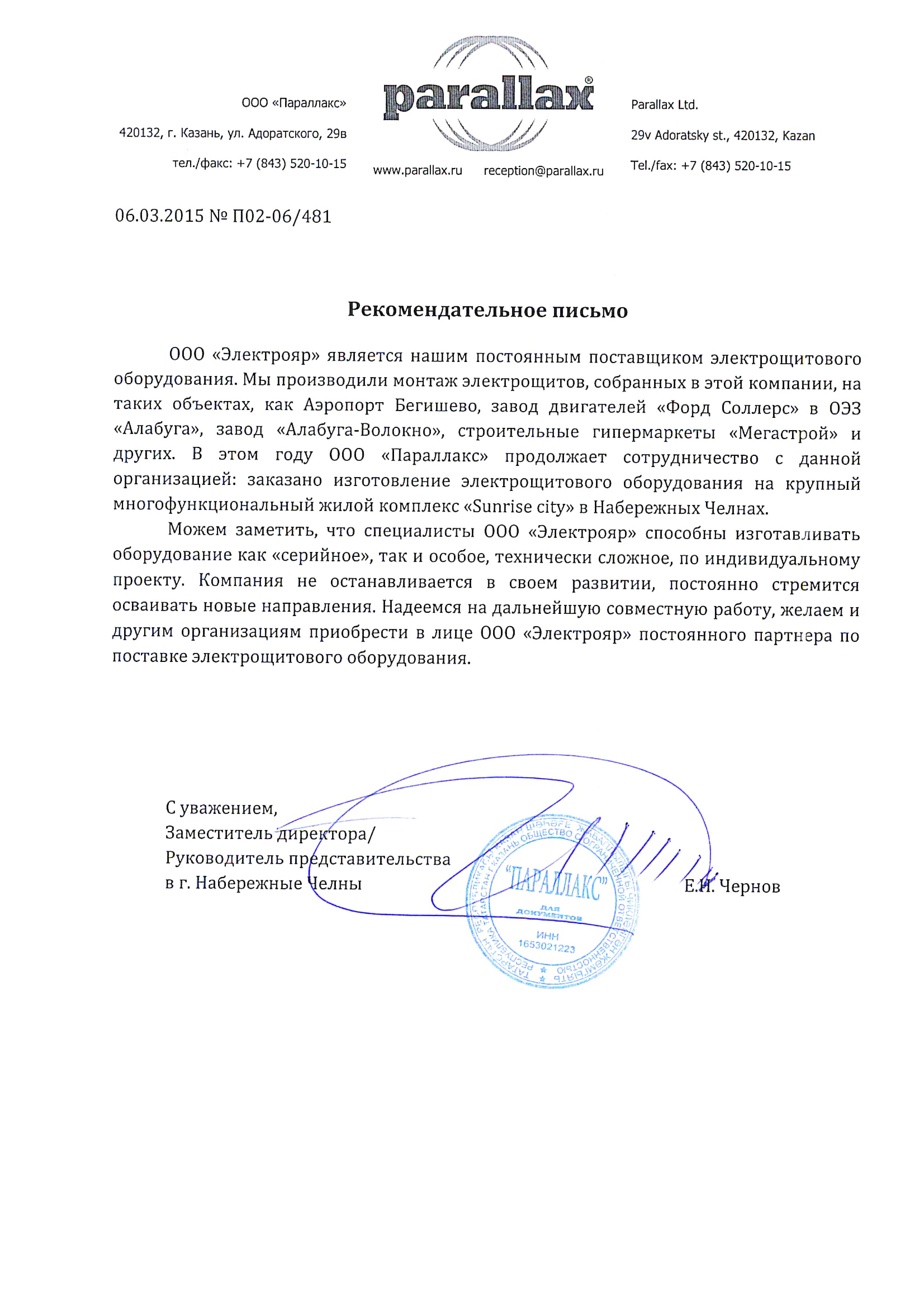ООО «Электрояр» является нашим постоянным поставщиком электрощитового оборудования. Мы производили монтаж электрощитов, собранных в этой компании, на таких объектах, как Аэропорт Бегишево, завод двигателей «Форд Соллерс» в ОЭЗ «Алабуга», завод «Алабуга-Волокно», строительные гипермаркеты «Мегастрой» и других. В этом году ООО «Параллакс» продолжает сотрудничество с данной организацией: заказано изготовление электрощитового оборудования на крупный многофункциональный жилой комплекс «Sunrise City» в Набережных Челнах.