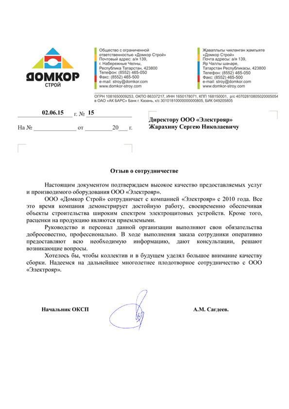 ООО «Домкор Строй», отзыв о сотрудничестве