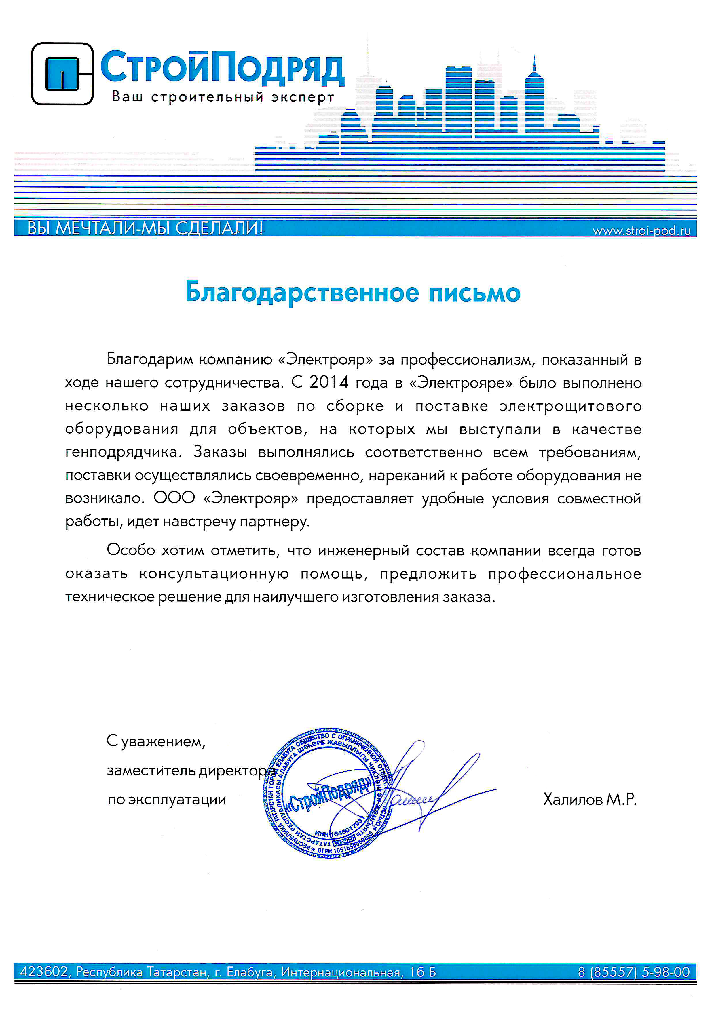 ООО «Стройподряд», благодарственное письмо