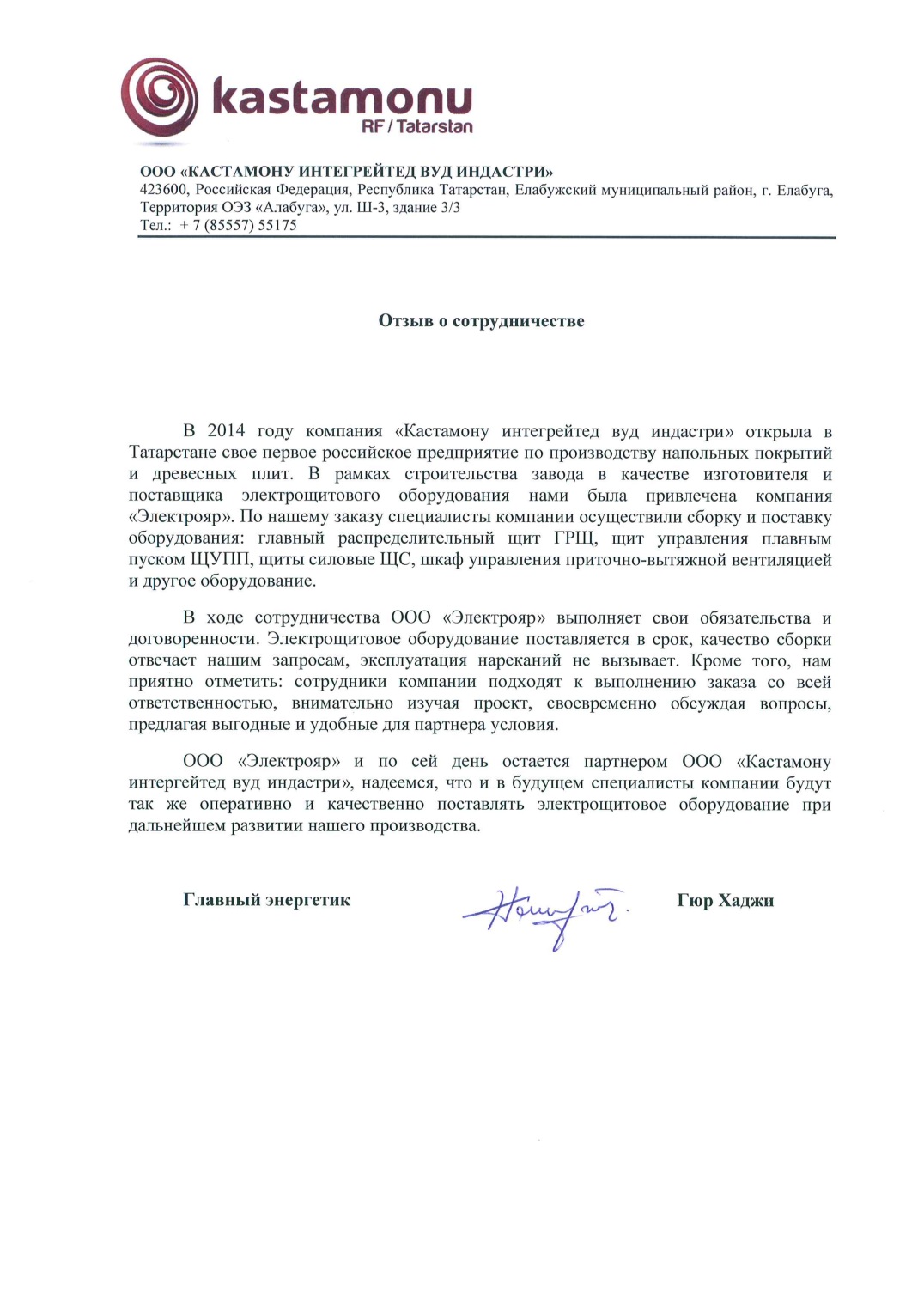 ООО «Электрояр» и по сей день остается партнером ООО «Кастамону интергейтед вуд индастри», надеемся, что и в будущем специалисты компании будут так же оперативно и качественно поставлять электрощитовое оборудование при дальнейшем развитии нашего производства.