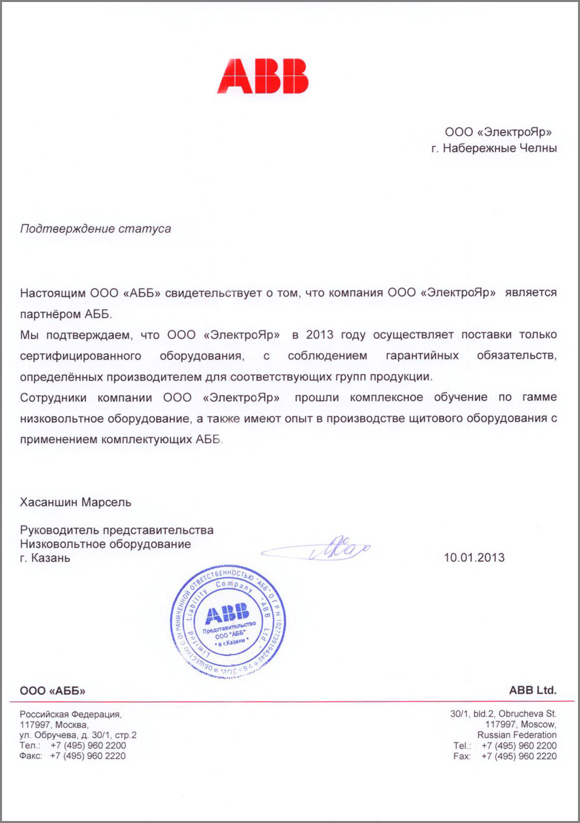 Настоящим ООО «АББ» свидетельствует о том, что компания ООО «Электрояр» является партнером АББ.
