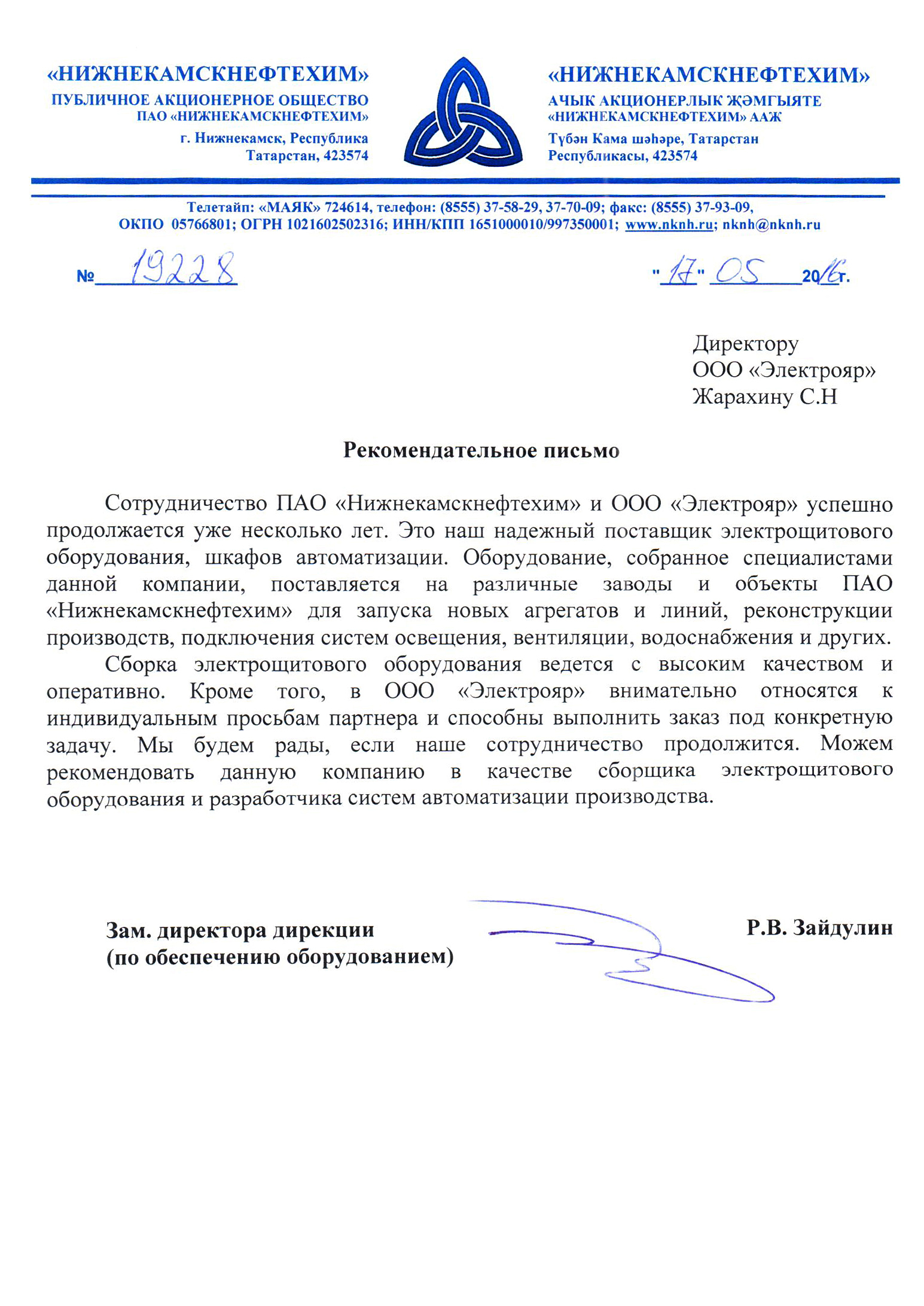 ПАО «Нижнекамскнефтехим», рекомендательное письмо