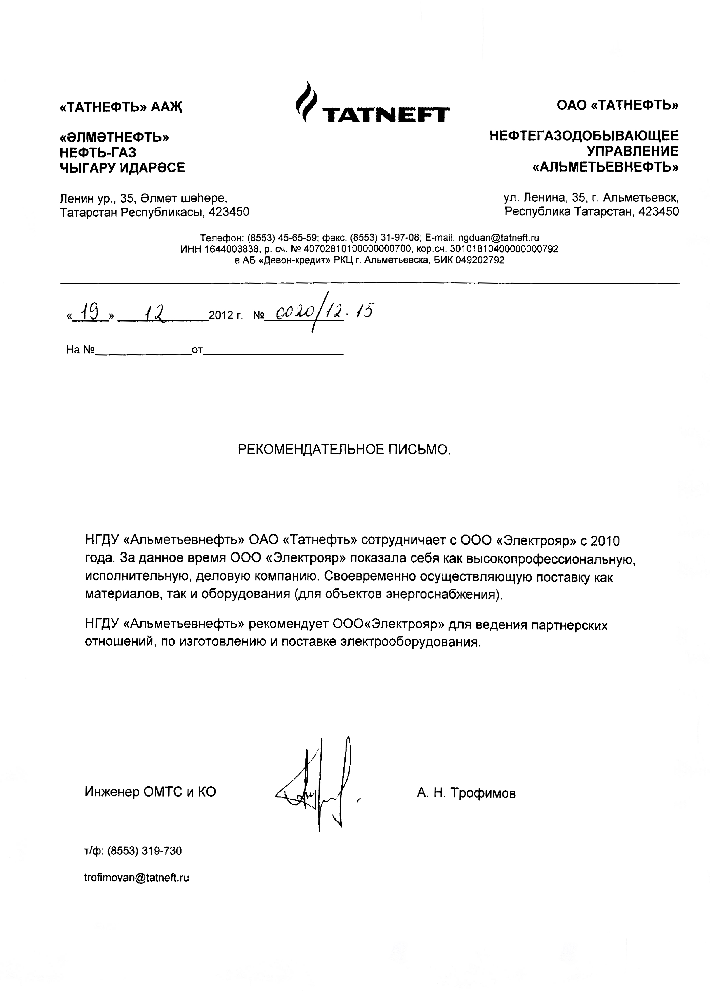 ОАО «Татнефть», НГДУ «Альметьевнефть», рекомендательное письмо