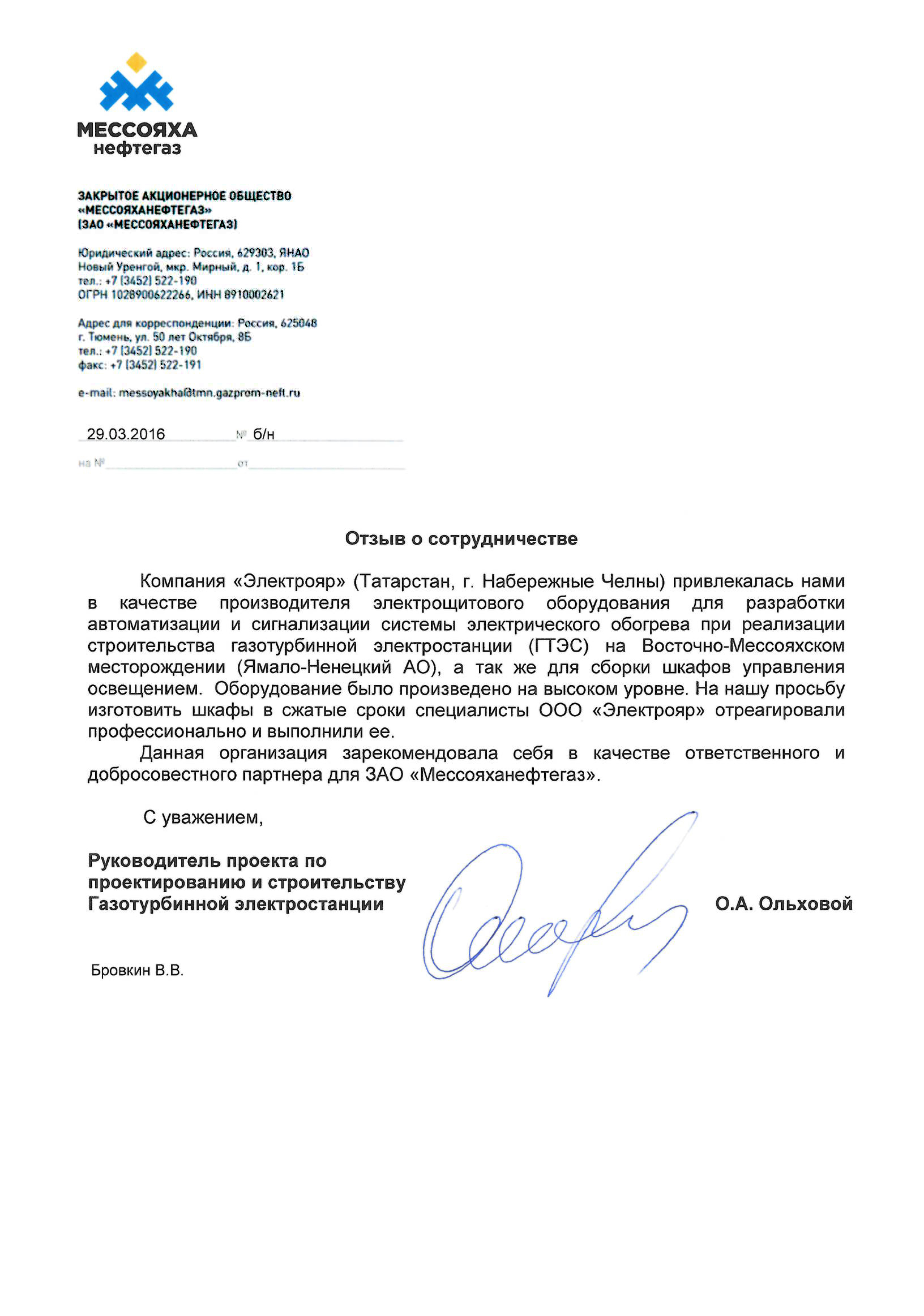 ПАО «Газпромнефть», ЗАО "Мессояханефтегаз, отзыв о сотрудничестве