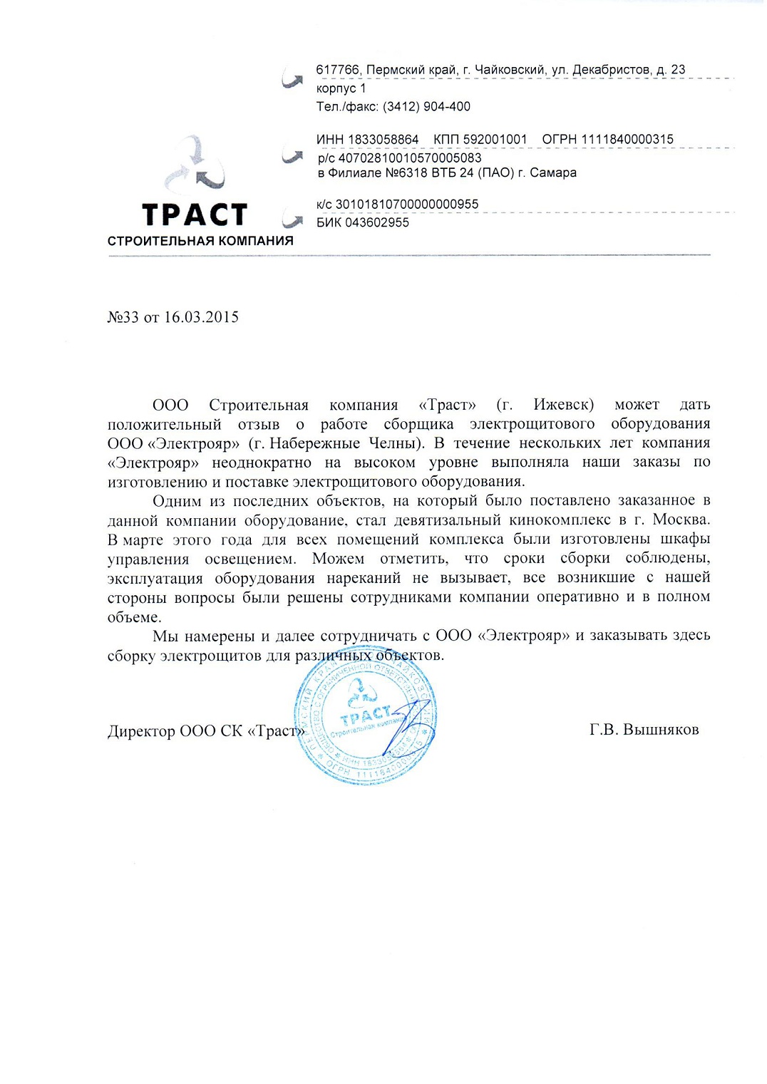 ООО «Строительная компания «Траст», рекомендательное письмо