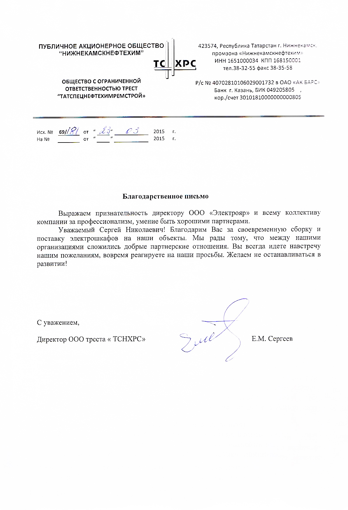 ПАО «Нижнекамскнефтехим», ООО «Татспецнефтехимремстрой», благодарственное письмо